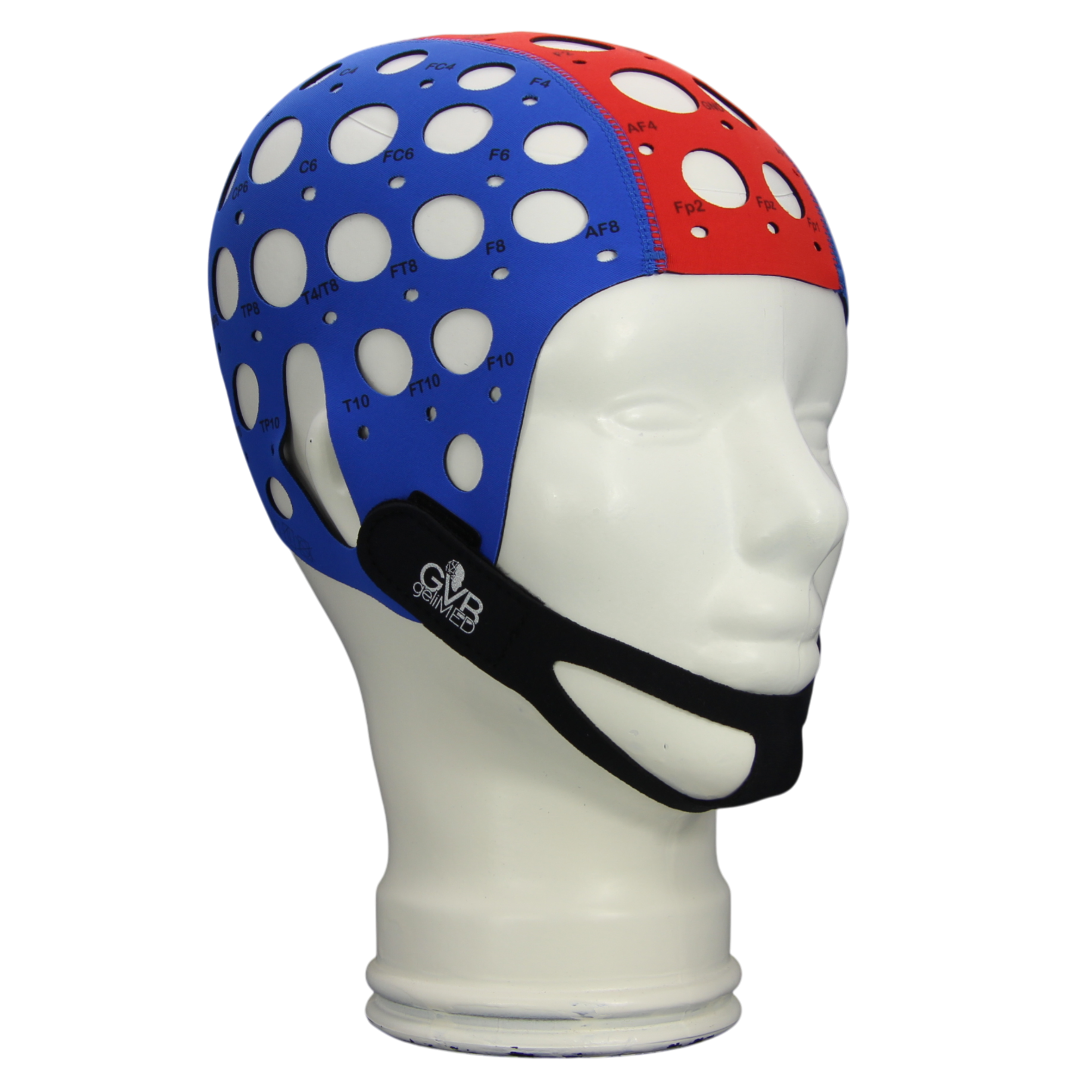 All caps are clearly marked with electrode positions and can be securely fastened with a chin strap and chest strap.
