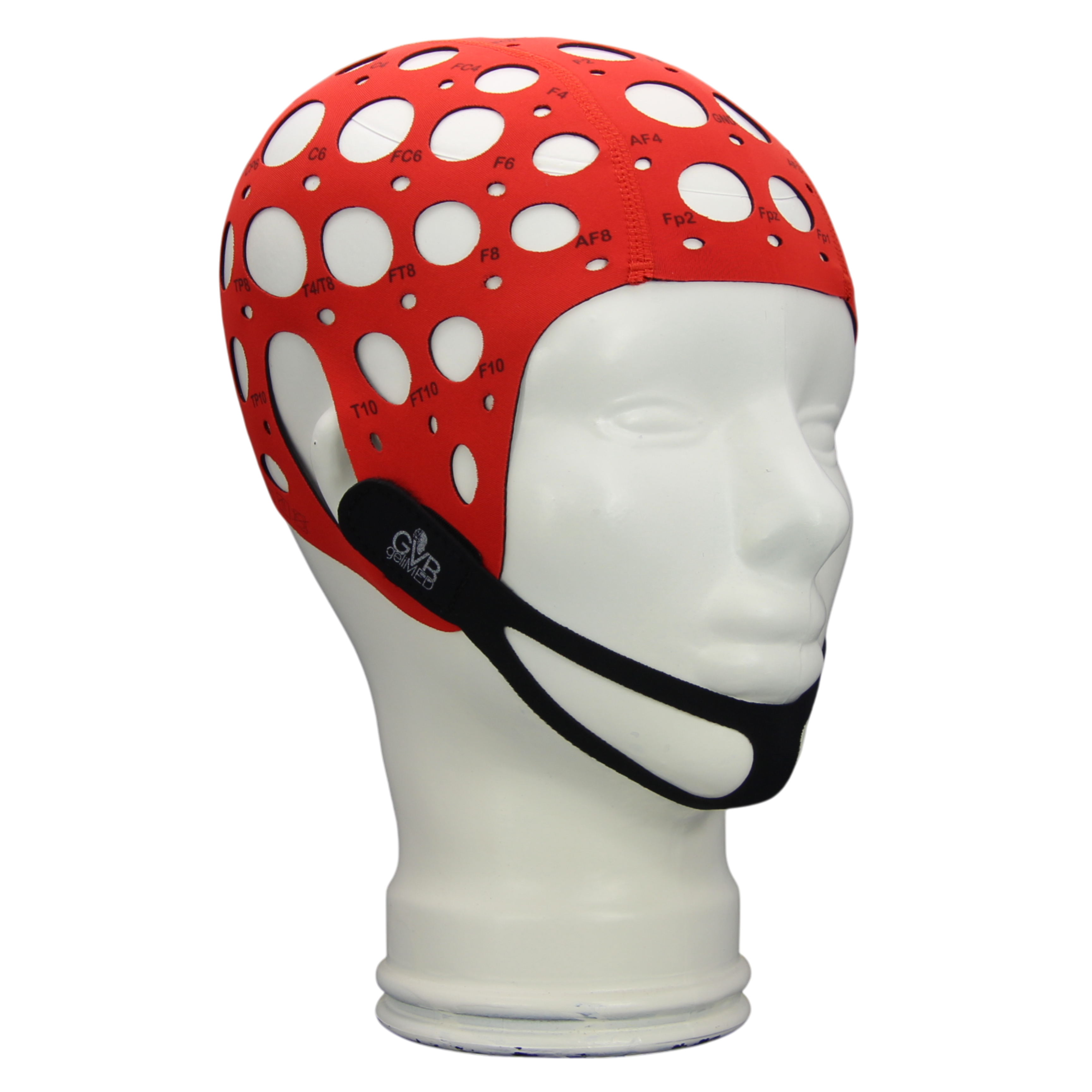 All caps are clearly marked with electrode positions and can be securely fastened with a chin strap and chest strap.