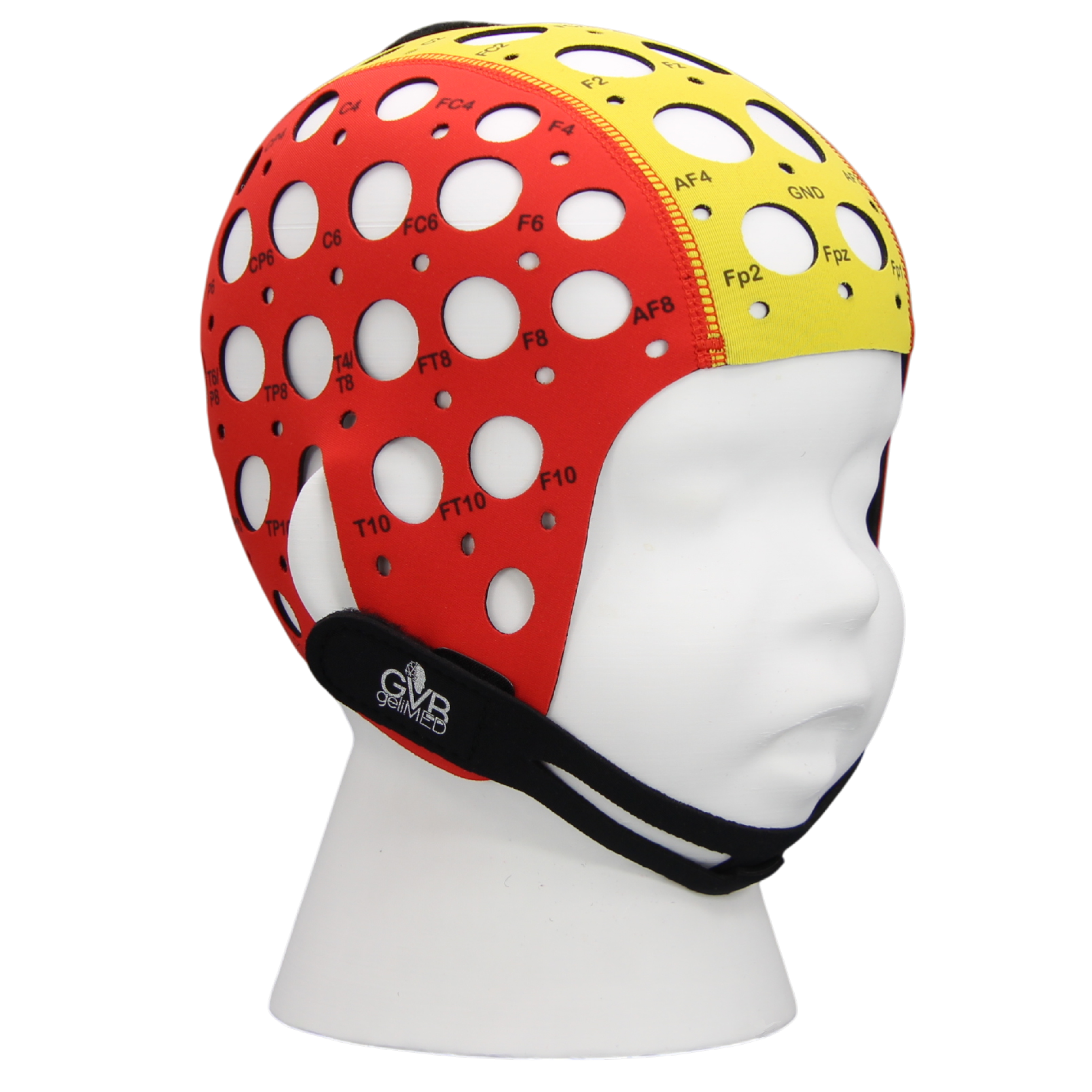 All caps are clearly marked with electrode positions and can be securely fastened with a chin strap and chest strap.