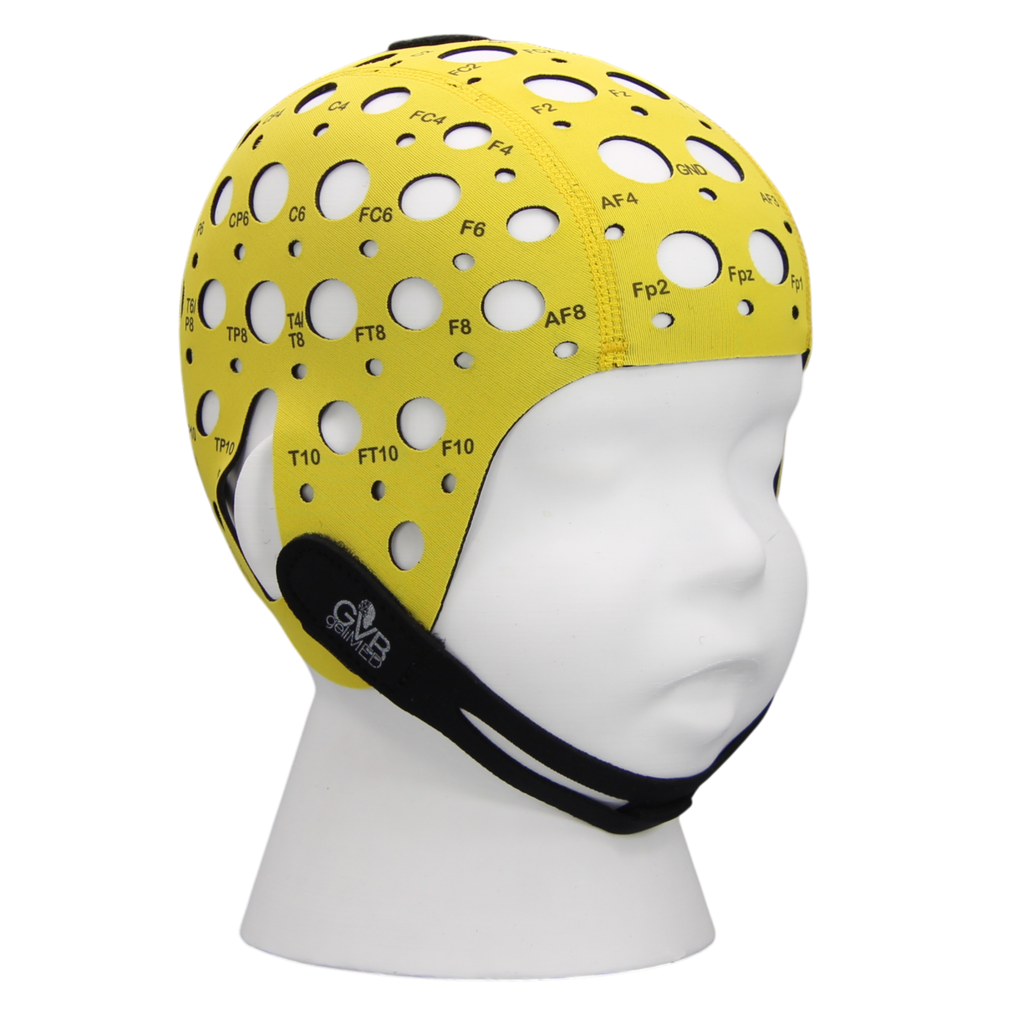 All caps are clearly marked with electrode positions and can be securely fastened with a chin strap and chest strap.